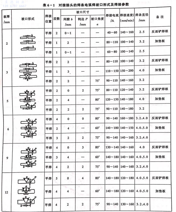 不銹鋼焊(han)接(jie)的坡口(kou)(kou)選(xuan)擇很關鍵(jian)。坡口(kou)(kou)形(xing)式的選(xuan)擇原則(ze)是(shi)保證(zheng)焊(han)接(jie)接(jie)頭(tou)質量,保證(zheng)焊(han)透和(he)盡(jin)量避免產生焊(han)接(jie)缺陷和(he)焊(han)接(jie)變形(xing),盡(jin)可(ke)能減少焊(han)接(jie)材(cai)料的消耗量,同時(shi)必須確保工藝的可(ke)操作(zuo)性。在(zai)板厚小于3mm時(shi)不用(yong)開坡口(kou)(kou);當(dang)板厚大于3mm時(shi)可(ke)選(xuan)用(yong)V形(xing)坡口(kou)(kou);厚度更(geng)大(20mm以(yi)上(shang))時(shi)可(ke)用(yong)X形(xing)坡口(kou)(kou)或U形(xing)坡口(kou)(kou)。表6-1是(shi)常見焊(han)條電弧焊(han)坡口(kou)(kou)形(xing)式。