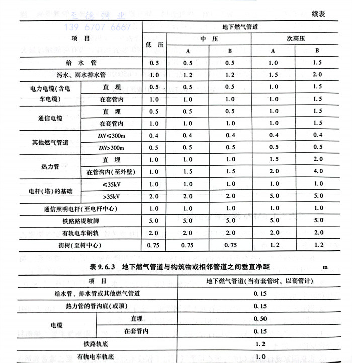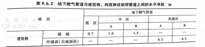 4. 高(gao)壓(ya)地下燃氣管道與構(gou)筑物或相鄰管道之(zhi)間(jian)的水平和垂直凈距(ju)(ju)不(bu)應小于(yu)表9.6.2.和表9.6.3次高(gao)壓(ya)A的規定。但高(gao)壓(ya)A和高(gao)壓(ya)B地下燃氣管道與鐵路路堤(di)坡腳(jiao)的水平凈距(ju)(ju)分別不(bu)應小于(yu)8m和6m;與有(you)軌電車鋼軌的水平凈距(ju)(ju)分別不(bu)應小于(yu)4m和3m,當(dang)達不(bu)到凈距(ju)(ju)要求時,采(cai)取行之(zhi)有(you)效的防護措施后,凈距(ju)(ju)可(ke)適當(dang)縮小。